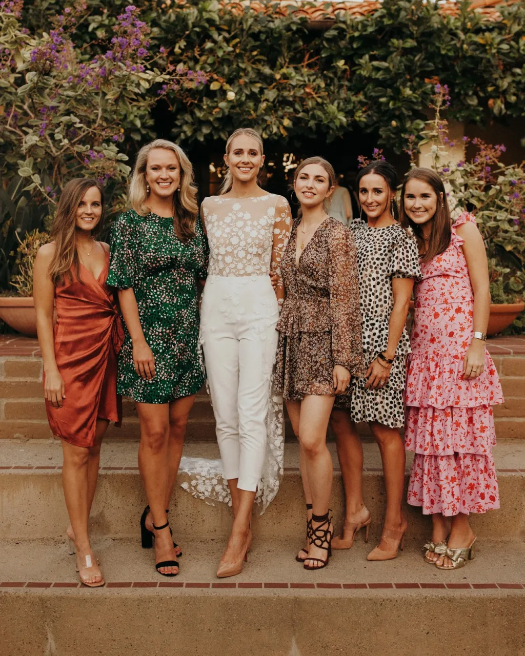 groupe de femmes portant des robes de mariée semi-formelles aux couleurs vives et colorées, longueur au sol, dans un style mix and match